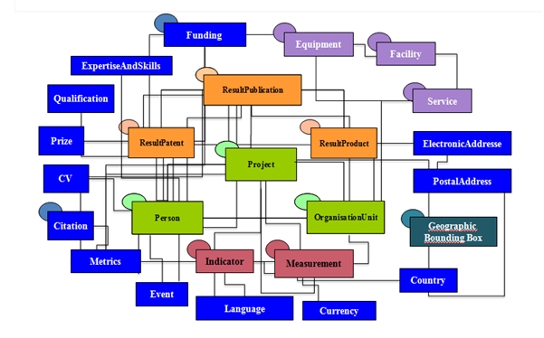 The data model (data-centric) allows for a (metadata) representation of research entities, their activities / interconnections (research) and their output (results) as well as high flexibility with formal (semantic) relationships, enables quality maintenance, archiving, access and interchange of research information and supports knowledge transfer to decision makers, for research evaluation, research managers, strategists, researchers, editors and the general public.